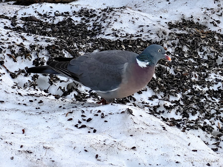 Несколько дней так вяхирь прилетал, деловито расхаживал по шелухе, вмёрзшей в снег, что-то раскапывал, оглядывался по сторонам, вдумчиво смотрел вдаль и продолжал искать еду. На самом деле, удивительно, ведь вяхирь - очень осторожная птица. Более того, кормится, не слишком далеко улетая от своего гнезда. А тут вдали от отчего дома, не обращая никакого внимания на меня с телефоном в руках, замаскировавшегося под форточку.